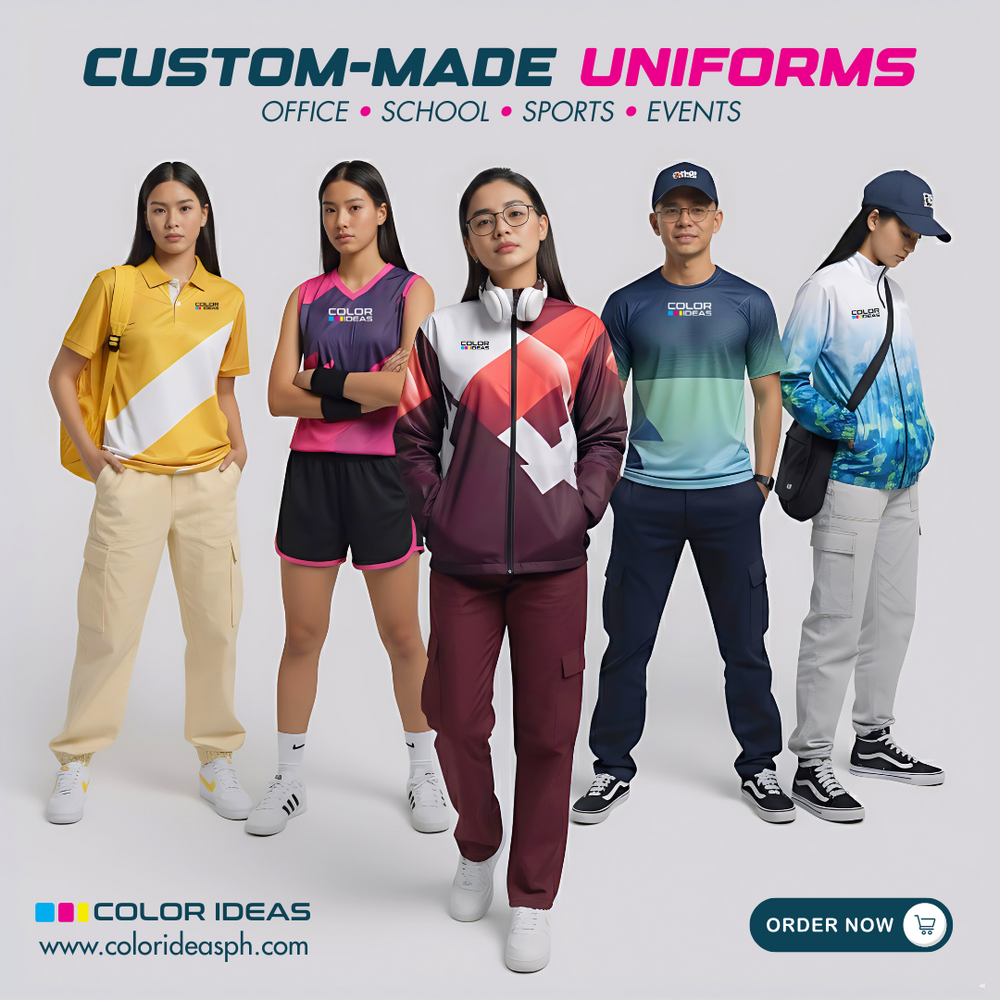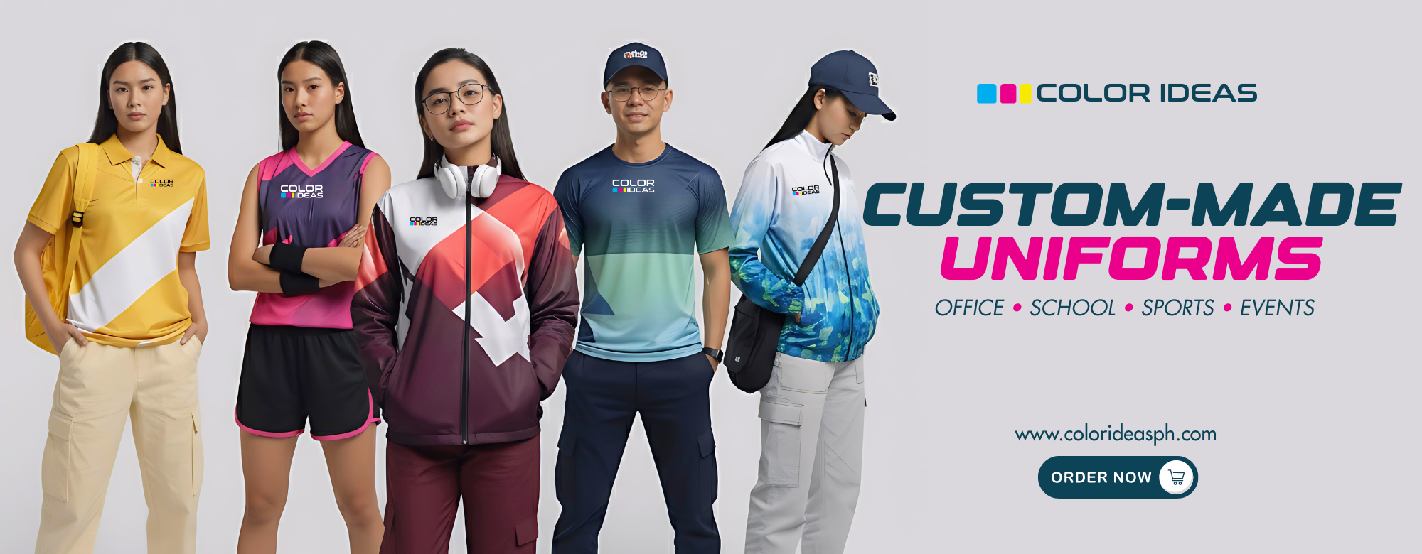 At COLOR IDEAS, we specialize in creating high-quality custom-made uniforms tailored to your unique specifications. In addition to our custom offerings, we also provide ready-to-wear apparels, Pro X Unlimited (Sports Apparel) and Souvenirs PH (Philippine Souvenir Shirts).
